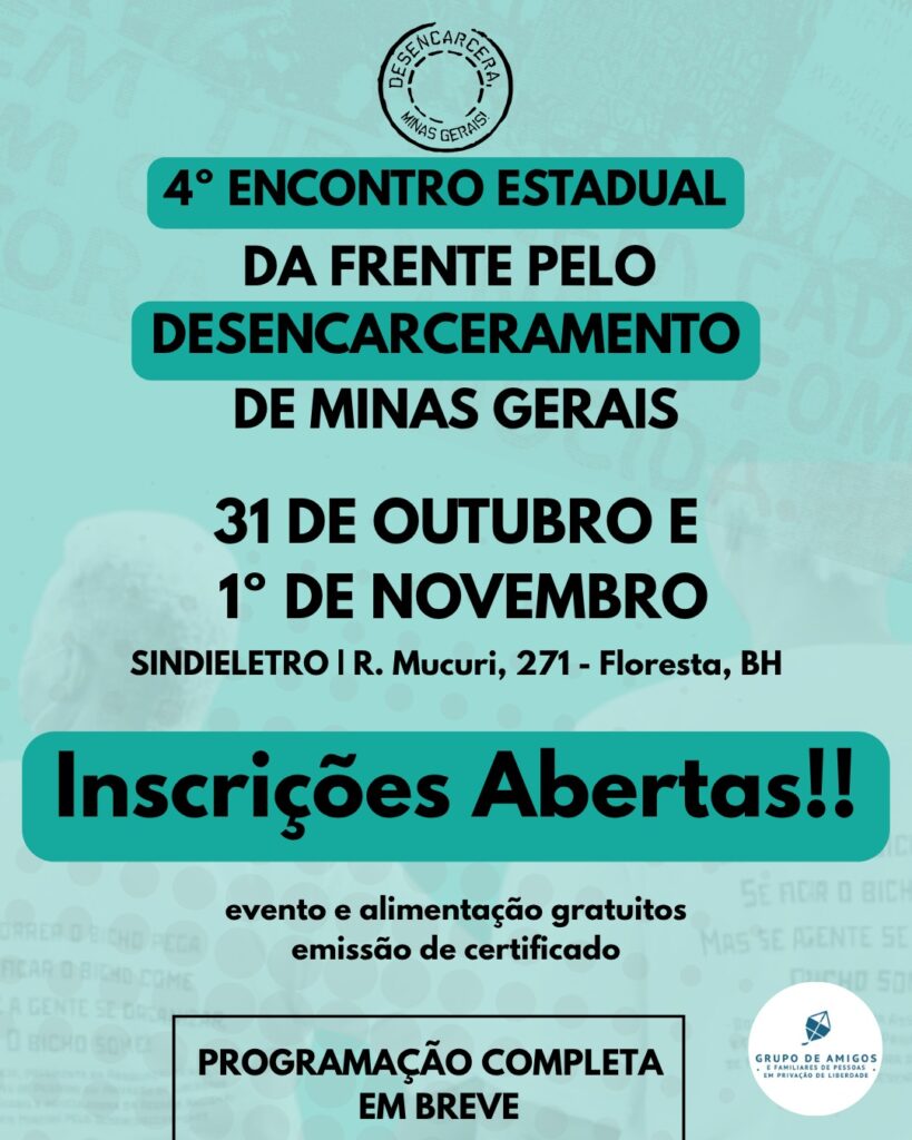 A Escola Superior da Defensoria Pública de Minas Gerais (Esdep-MG) divulga a abertura das inscrições para o 4º Encontro Estadual da Frente pelo Desencarceramento de Minas Gerais, que será realizado nos dias 31 de outubro e 1º de novembro, no Sindieletro (Rua Mucuri, 271 – Floresta, Belo Horizonte).